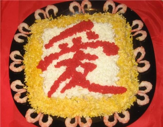 При помощи белка и желтка можно нарисовать иероглиф «Любовь», для этого нужно воспользоваться трафаретом. Этот салат приятно удивит оформлением, и необычным вкусом, однако для его создания потребуется час. Такой салат можно приготовить к особому случаю и порадовать своих близких, показать свою любовь и привязанность посредством этого салата.