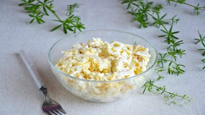 Салат, приготовленный на основе домашнего майонеза, отличается пикантным, нежным вкусом. Для этой закуски на 4 порции следует взять: