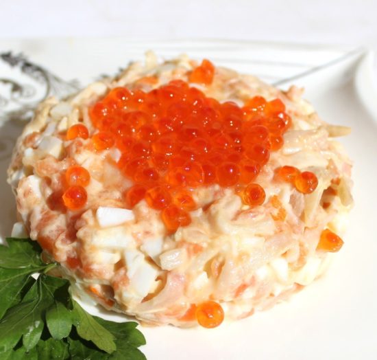Перед подачей салата, нужно украсить икрой.