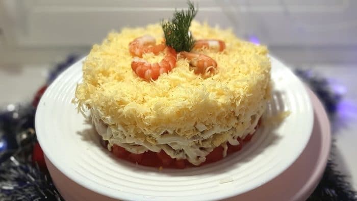 - Четвертый слой – креветки со сметанным соусом.