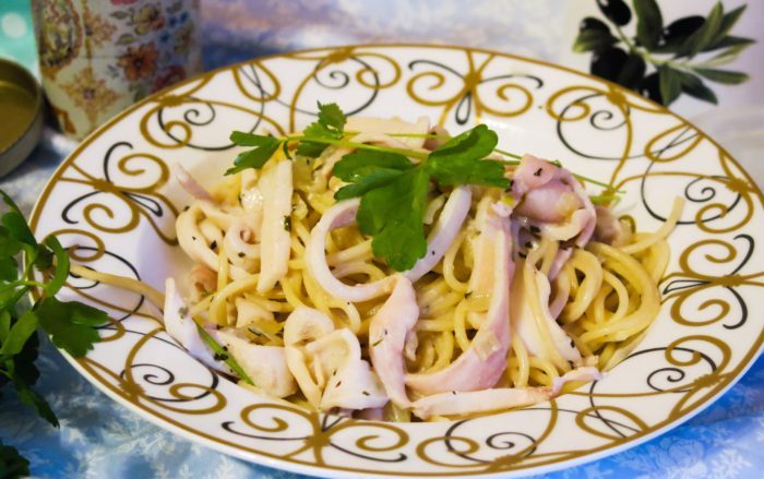 Этот известный рецепт пользуется популярностью, так как очень прост в приготовлении и не требует много продуктов, для создания спагетти с кальмарами по рецепту Юлии Высоцкой, следует взять следующие продукты: