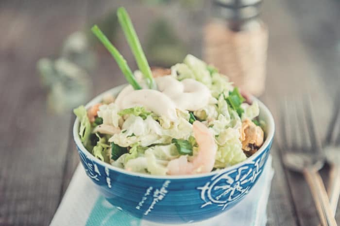 - Как только морепродукты остыли, к ним добавляют овощи и зелень. Заправку заливают непосредственно перед трапезой.