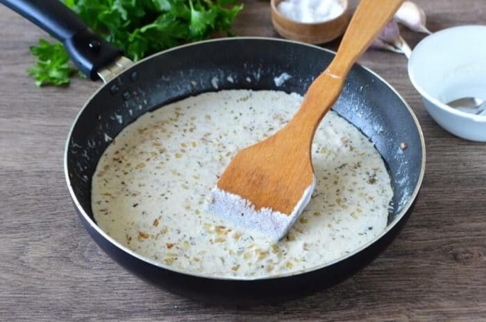 - Налейте сметану и тушите несколько минут блюдо, накрыв крышкой.