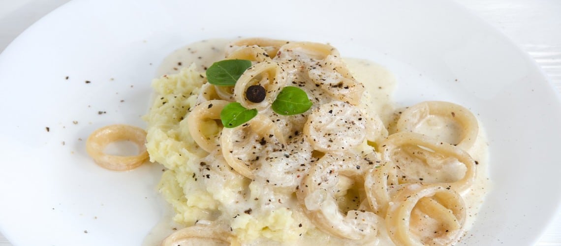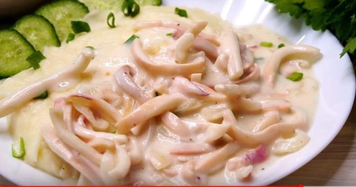 В идеале можно подавать жареные или тушеные кальмары по-строгановски в таком чесночном соусе с рисом или пюре из картофеля. Главный секрет этого блюда – знать, сколько нужно тушить морепродукты и свежая сметана.