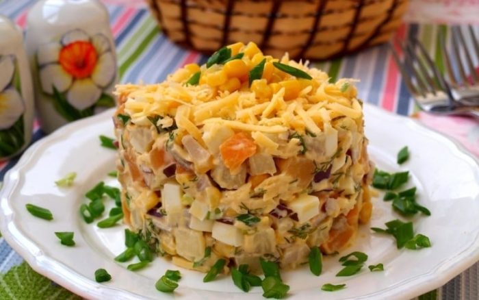 - Затем идёт слой кукурузы. Каждый из продуктов перед соединением предварительно пропитать небольшим количеством сметаны или салатного йогурта поверх посыпать немного мелко порубленного укропа.