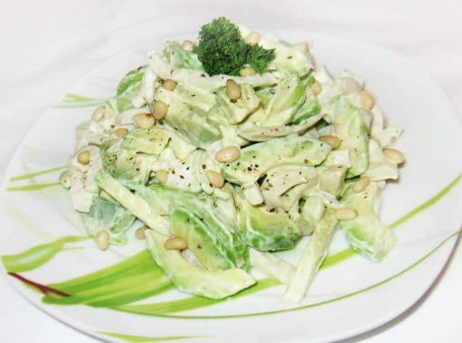 Это лёгкое и вкусное блюдо порадует каждого гармоничным послевкусием. Наличие в составе фруктов, орехов и овощей делают кулинарное произведение еще и очень полезным. А презентабельная подача станет несомненным плюсом при сервировке любого праздничного стола.