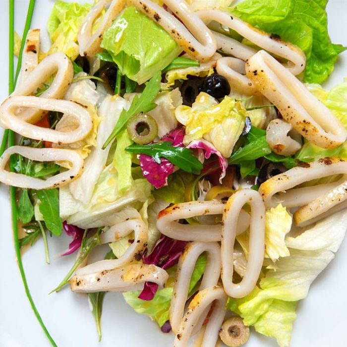 Этот легкий перекус понравится гурманам и всем любителям морепродуктов. Получилась очень сытная и питательная, но одновременно легкая и нежная закуска. К тому же она содержит много витаминов и необходимых питательных веществ, которые восполнят дневной запас необходимых организму микроэлементов. Такой салат внесет разнообразие в повседневное меню, а также будет желанным гостем на праздничном столе.