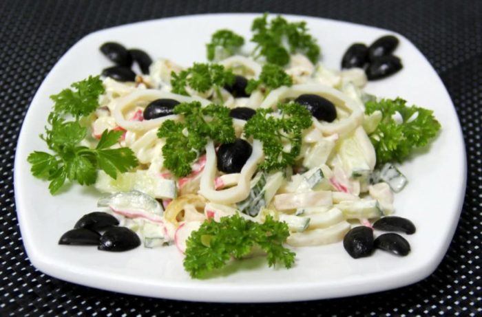 Морепродукт нужно нарезать полосками, вареные куриные яйца порубить, маслины нарезать кружочками, лук – как можно мельче. Заправлять готовый продукт и добавлять сухарики нужно непосредственно перед подачей, иначе сухарики размокнут и не будут хрустеть.