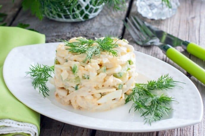 - заправляем майонезом. Его при желании можно заменить нежирным йогуртом, превратив рецепт в диететический; соль, перец, лимонный сок.