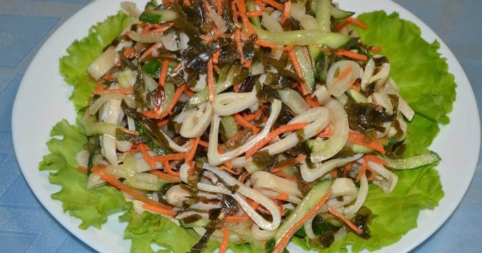 Морская капуста–полезный диетический продукт с низкой калорийностью, богатый йодом, а также всеми необходимыми для здоровья человека витаминами и микроэлементами. Морскую капусту стоит выбирать без добавления уксуса. Салат из консервированного кальмара с морской капустой и сурими понравится тем, кто следит за питанием и калориями.