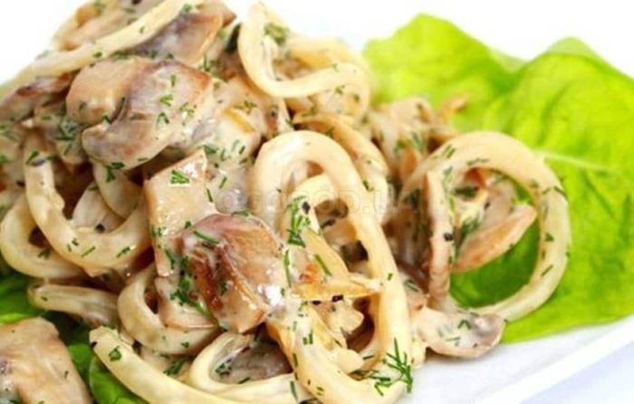 - Мясо кальмара измельчить, положить в салатник. Грибы помыть, дождаться пока они обсохнут, после чего измельчить их средними дольками, а луковицу – полукольцами.