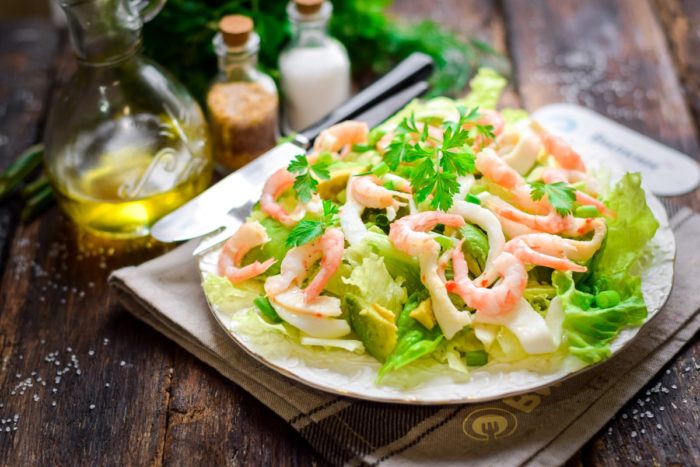 - После того, как креветки остыли, их можно очистить и отложить в салатник. Следом же отправить морепродукты, нарезанные кольцами или полосками. По желанию, вместо тушек можно добавить щупальца. Вкус останется тем же.