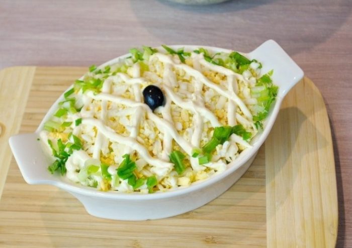 - Заправляем выбранным соусом, аккуратно перемешиваем. Оригинальность придать можно свежей зеленью, красной икрой, четвертинками или половинками перепелиных яиц, оливок, маслин. В Сети есть множество примеров того, как эффектно оформить праздничное блюдо. Среди красивых фото выбрать подходящий вариант будет несложно. Подавать готовое блюдо на стол можно на большой тарелке, а также порционно.