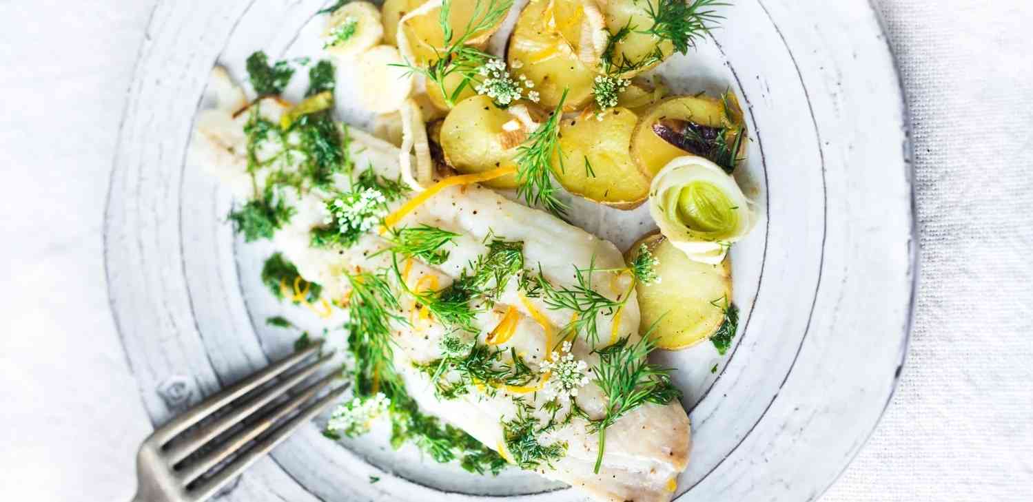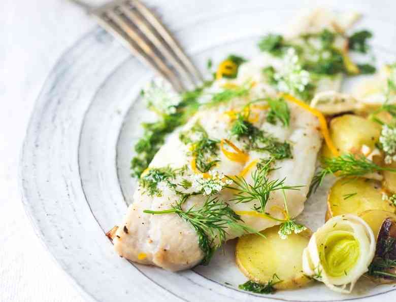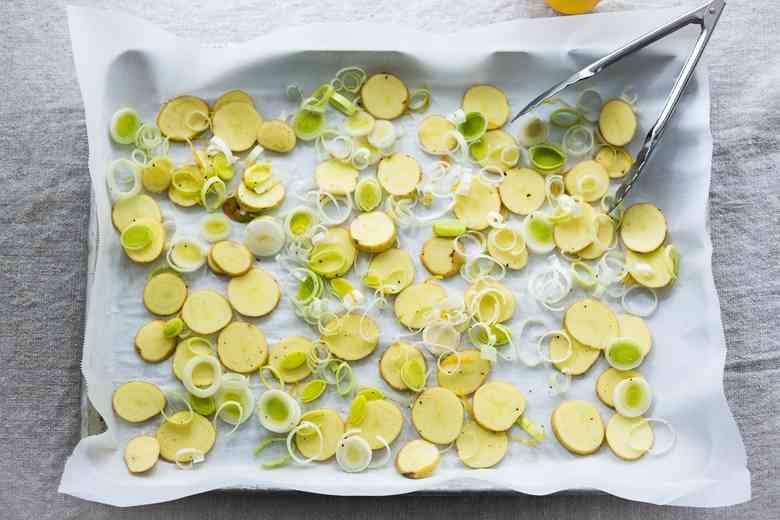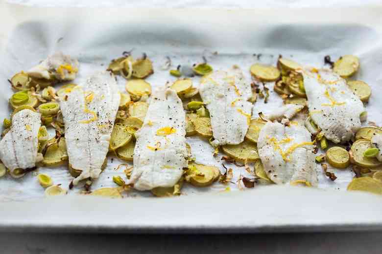 Разогрейте духовку до 220 градусов. Порежьте картофель и лук-порей тонкими дольками и кольцами соответственно. Смешайте их в миске с оливковым маслом, солью, перцем и лимонной цедрой. Поскольку картошка и лук запекаются немного дольше, чем тонкое филе камбалы, выложите их на выстеленный бумагой для выпечки противень и поставьте в духовку. Запекайте в течение 20 минут.