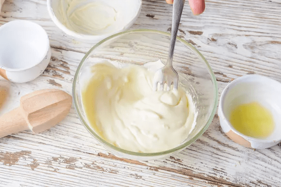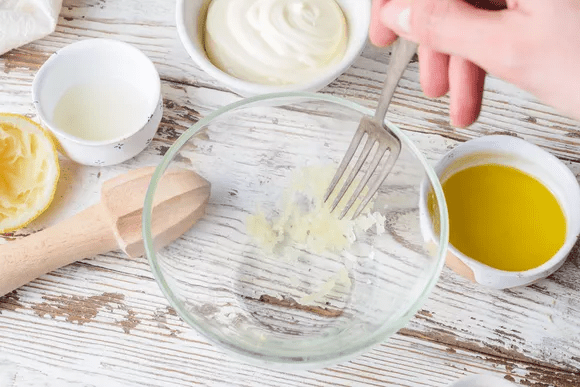 Добавьте майонез, оливковое масло и лимонный сок, затем взбейте вилкой.