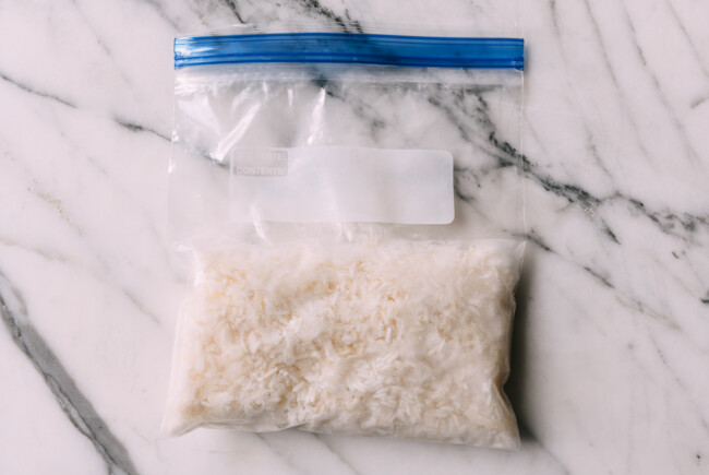 Промойте рис 1-2 раза, перемешивая его в воде руками. Затем погрузите рис в чистую воду и замочите на 30 минут. Через полчаса слейте воду и переложите крупу в герметичный пакет или контейнер, подходящий для морозилки. Замораживайте не менее 8 часов (лучше оставить на ночь).
