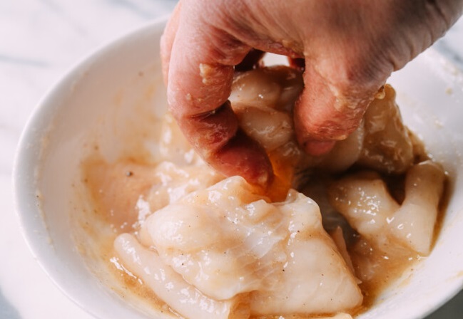 Замаринуйте камбалу, добавив соль, белый перец, устричный соус, рисовое вино и тёртый имбирь. При помощи рук тщательно покройте рыбу маринадом со всех сторон. Добавьте яичный белок и еще раз аккуратно перемешайте. Накройте миску перевернутой тарелкой и поставьте в холодильник на 15 минут, чтобы камбала промариновалась.