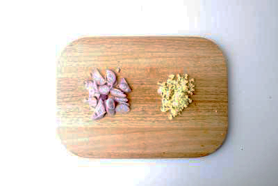 Лук-шалот очистите и мелко нарежьте. С имбиря соскоблите кожицу и измельчите. Огурец нарежьте полосками и залейте рисовым уксусом.