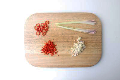 Часть красного перца чили нарежьте кружочками, а вторую часть – мелко порубите. Лемонграсс раздавите скалкой, достаньте мягкую сердцевину и мелко нарежьте.