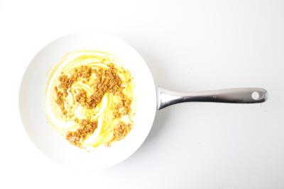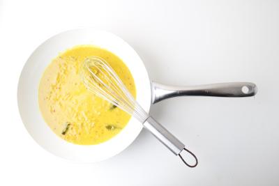 На среднем огне нагрейте антипригарную сковороду с растительным маслом. Добавьте лук-шалот с щепоткой соли и жарьте 3 минуты. Затем к луку добавьте имбирь, сердцевину лемонграсса, измельченную часть красного перца чили. Готовьте 1 минуту. Далее всыпьте куркуму, жарьте еще 30 секунд, периодически помешивая.