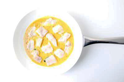 Кусочки рыбы промойте и обсушите бумажными полотенцами и посолите, затем выложите в загустевший соус, накройте крышкой и тушите до готовности рыбы. Мелко нарежьте базилик вместе со стеблями. Снимите блюдо с огня, добавьте базилик и аккуратно перемешайте.
