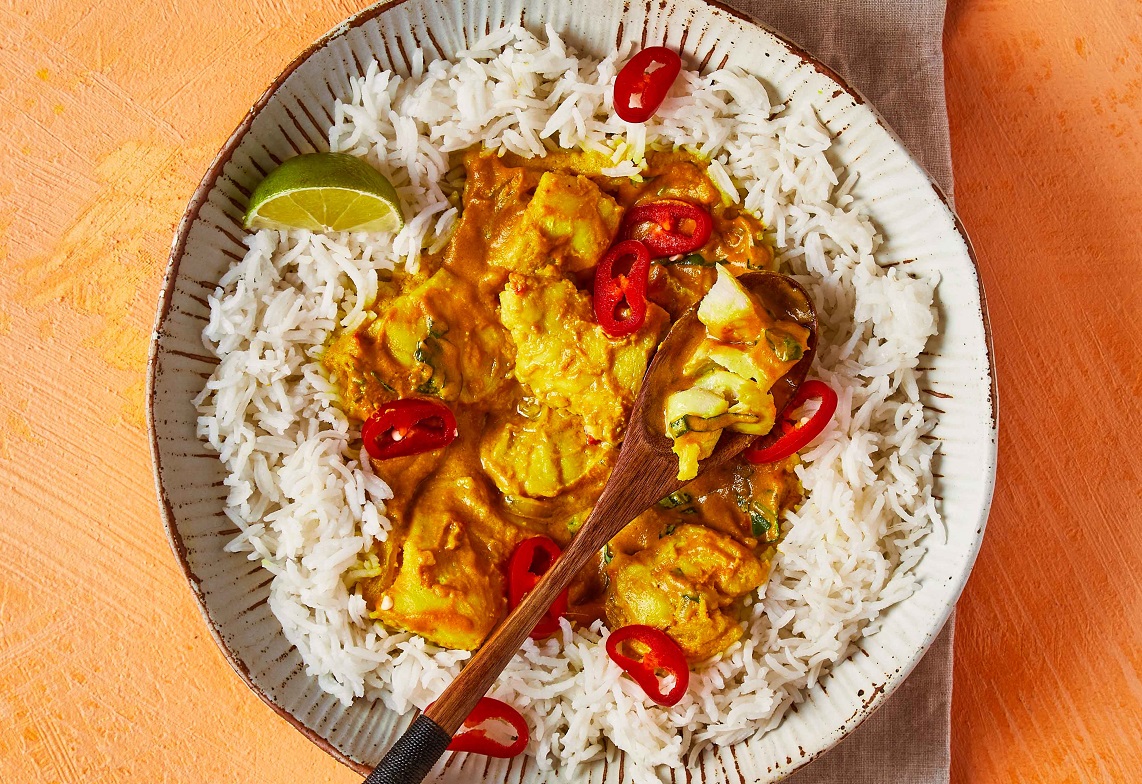 Приготовьте по нашему рецепту палтуса с рисом в азиатском стиле. Это блюдо вдохновлено камбоджийским рыбным карри. Палтус томится в остром ароматном кокосово-рыбном соусе. На гарнир подается лимонный рис, а также маринованные в рисовом уксусе огурцы.