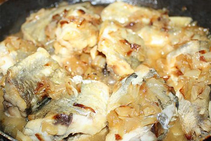 - сотейник смазать маслом, на дно выложить кусочки рыбы, картофель и жареный лук;