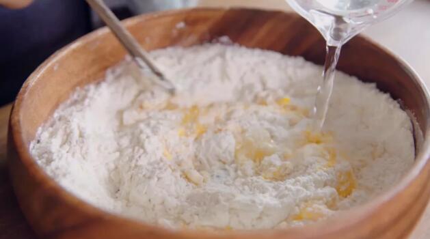 Для начала приготовьте тесто. Выложите муку в чашу кухонного комбайна и включите его на низких оборотах с насадками для замеса теста и постепенно вливайте воду. Взбивайте, пока тесто не соберется в однородный шар. Также можете замесить тесто ручным миксером или руками.