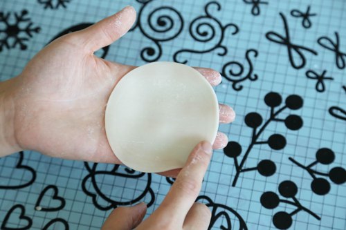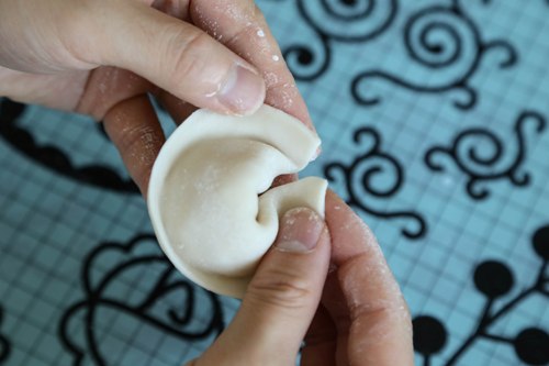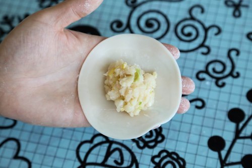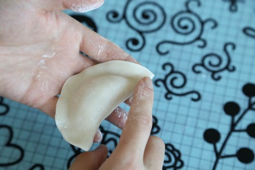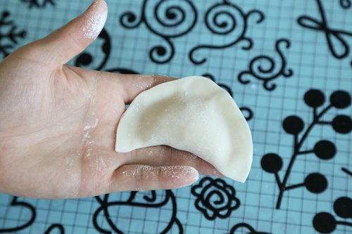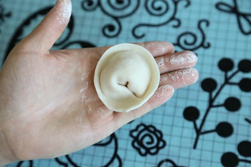 Тесто тонко раскатайте в колбаску и нарежьте на кусочки. Каждый из них раскатайте в ровные кружочки. Возьмите один кружочек, слегка смочите края водой.