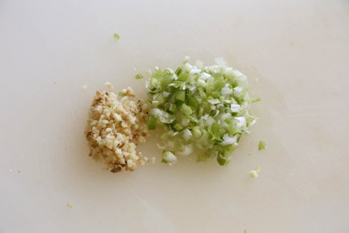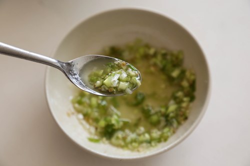 Нагрейте масло до дымления и медленно влейте горячее масло в миску к луку и имбирю. Перемешайте и отложите в сторону.
