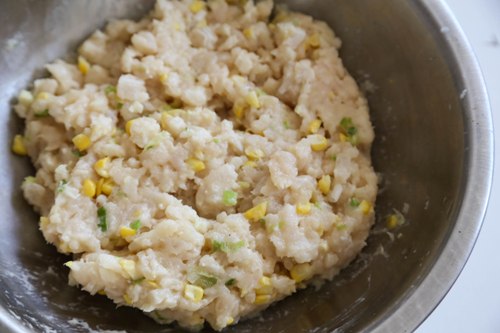 Добавьте к рыбе кукурузу, масло из имбиря и лука, крахмал, яйцо, соевый соус, белый перец.