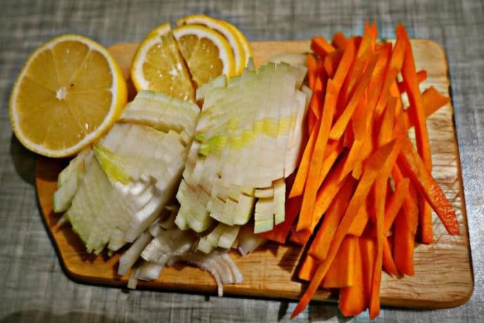 Также предварительно необходимо нарезать морковь соломкой, а лук порезать колечками. Одну луковицу можно положить в бульон целой, в конце её нужно будет достать из бульона и выкинуть, она соберёт в себе лишнюю горечь и оставить только вкусный наваристый бульон.