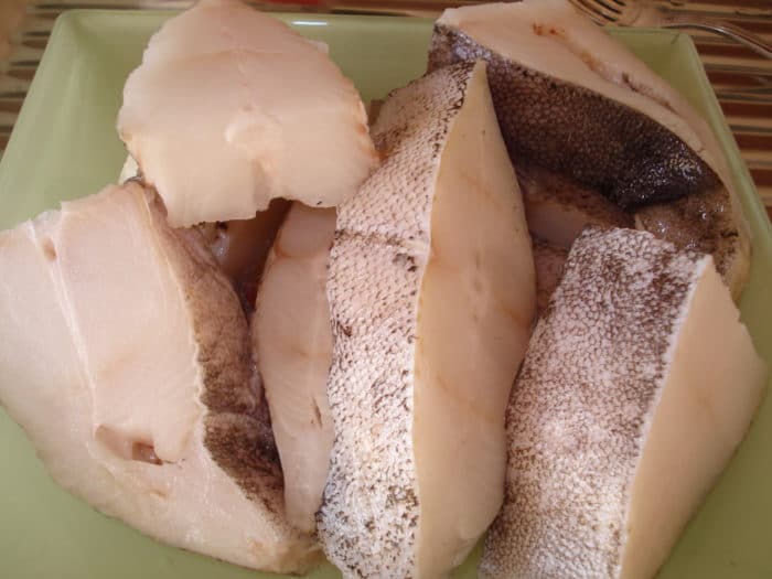 Половину тушки палтуса без головы необходимо нарезать небольшими кусочками по 3-4 см толщиной.