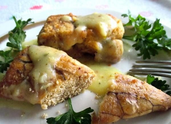 Жареный деликатес можно готовить как отдельное блюдо, а можно сочетать с разными продуктами. В качестве панировки можно использовать не только муку со специями для рыбы, но и сметану, кунжут, яичный кляр и другие. Подают теплой или горячей к салатам или гарнирам.