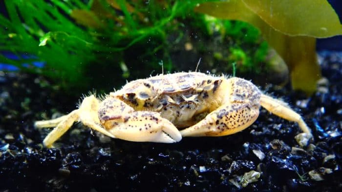Цвет панциря водолюба – серо-зеленый с фиолетовыми вкраплениями. В ширину он достигает 6 см. Большие клешни легко раскалывают панцири, помогая крабу в охоте. Также с их помощью удается поднимать камешки, чтобы обеспечить лучшую маскировку.