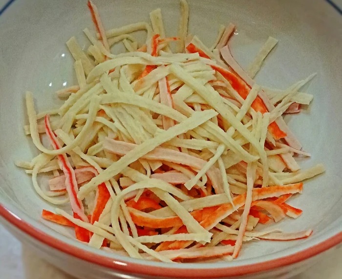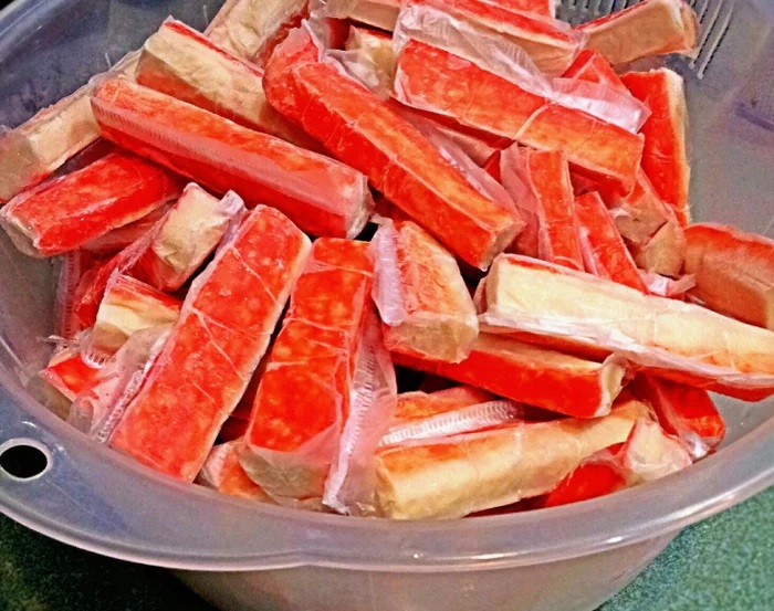 Крабовые палочки вытащите из упаковки.
