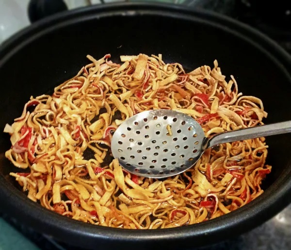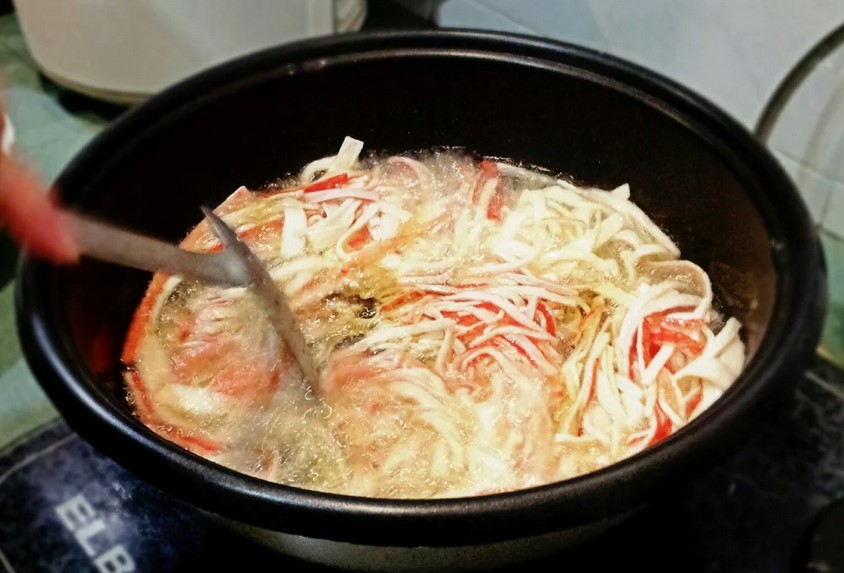 После проверки погрузите в масло порцию крабовых полосок.