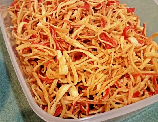 Разделите руками или разрежьте ножом палочки на полоски примерно 1 см шириной. Разложите на большом противне в один слой и дайте просохнуть в течение нескольких часов.