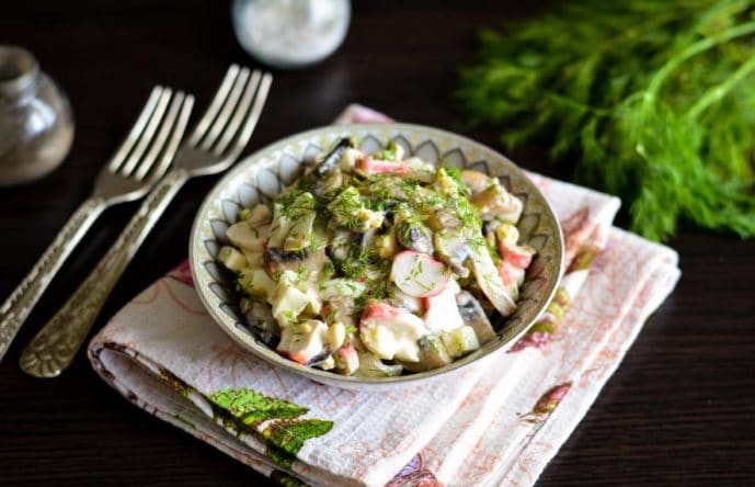 Хотя рецепт этого крабового салата без риса довольно долго готовить, его оценят по достоинству все любители грибов.