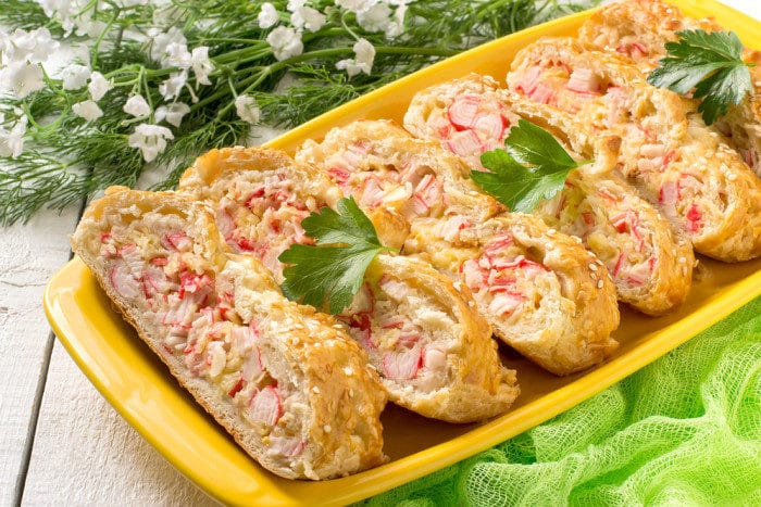 В рецептах с крабовыми палочками присутствует выпечка. Необычный подход для морепродукта. Можно приготовить своими руками изумительный заливной пирог, который не оставит равнодушным никого.