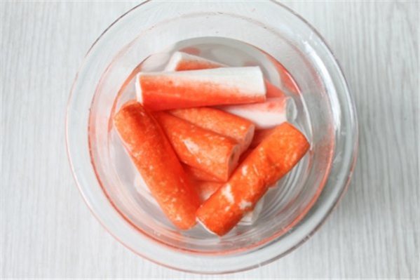 - Вынуть крабовое мясо из морозилки и разморозить естественным путём. Секретный способ разморозки: положить пачку крабового мяса в миску с горячей водой, после остывания, опять налить кипяток. Так продукт разморозится быстрее и палочки не будут ломаться и крошиться при резке и доставании из кастрюли.