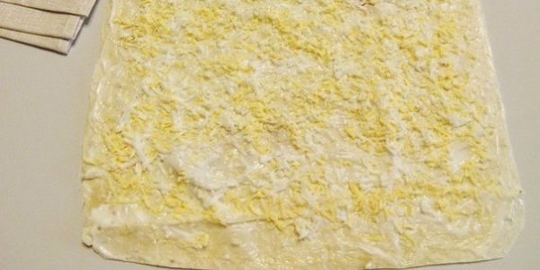 Свернуть в плотненький ролл. На второй лавашик выложить начинку из отварных яиц и майонезного соуса.