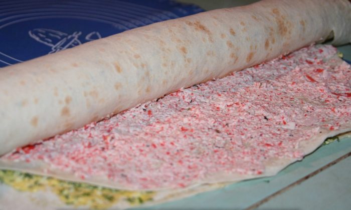 На третий лавашик нанести майонез и выложить начинку с крабовыми палками, после положить первый рулет и вновь свернуть все в ролл.
