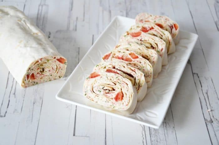 - На лист лаваша намазать полученную смесь и выложить поверх кубики томата.Свернуть в трубочку и оставить охлаждаться на пару часов в холодильной камере.