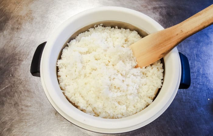 В остывший рис добавляем уксус, тщательно перемешиваем. Для смачивания рук в отдельную миску наливаем немного воды.