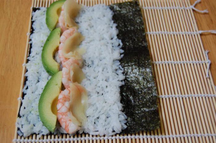 Авокадо и креветки (или крабовое мясо) нарезаем тонкой соломкой. Далее лист водоросли с рисом нужно аккуратно перевернуть. Посередине листы выкладываем нарезанные соломкой авокадо и креветки.