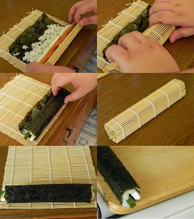 Сейчас нам нужно максимально аккуратно завернуть суши. Для этого мы берем концы циновки и сворачиваем лист нори в рулет. Получившийся ролл слегка придавливаем пальцами.