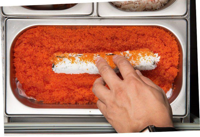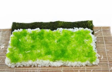 Далее на коврик нам нужно выложить чуть-чуть икры и покатать по ней наш ролл, слегка придавливая для получения квадратной формы.