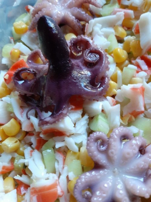 Салат с крабом и авокадо, с добавлением морепродуктов, а именно осьминогов признан низкокалорийным. Особенно подходит для тех, кто активно следит за своим питанием и количеством потребляемых калорий. В состав входят следующие продукты: