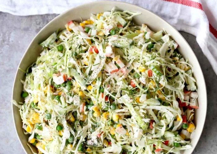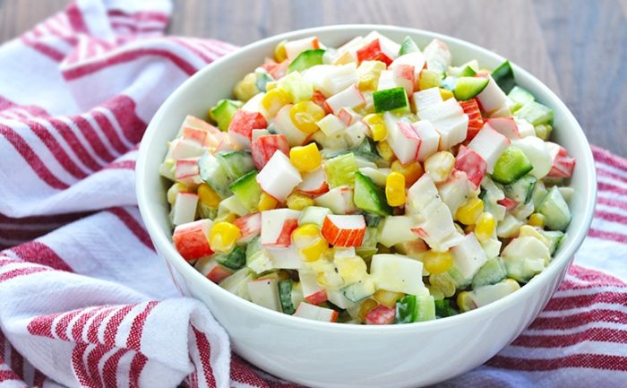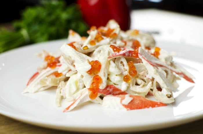 - Крабовый салат имеет питательную ценность – 170-175 кКал.